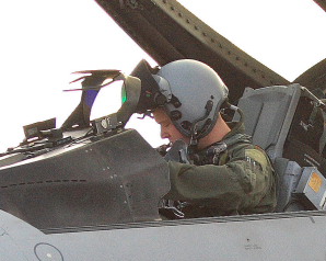 Nótese lo voluminoso del moderno casco JHCS, con presentación de información de vuelo integrada en el visor.